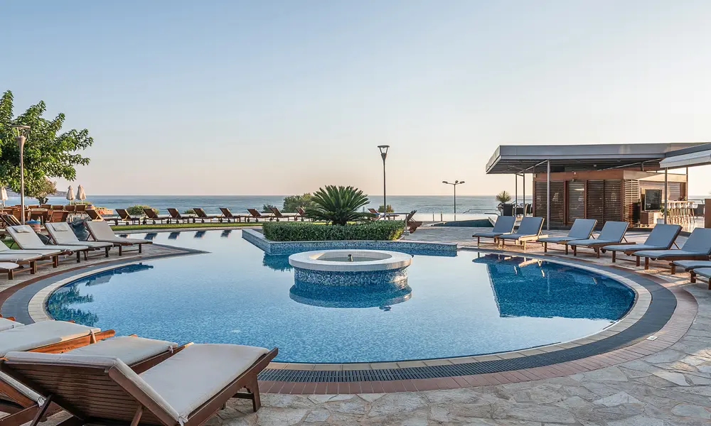 Poolområdet är hotellets naturliga samlingspunkt och ett trivsamt nav för semesterdagarna på Cretan Dream Resort & Spa. Den stora, inbjudande infinitypoolen ligger med vacker utsikt över havet och bjuder in till både simturer och lugna stunder på solstolen. Runt poolen finns bekväma solstolar och parasoller, och vid poolbaren kan hela familjen hämta kalla drycker, glass, snacks och cocktails under dagen.