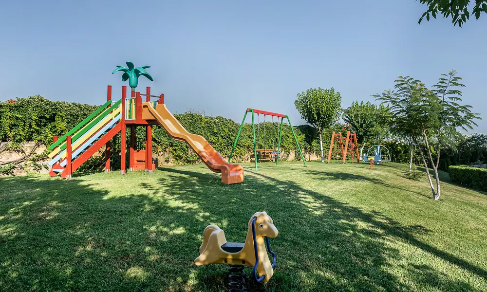 För de yngsta gästerna finns en separat barnpool, och bakom hotellbyggnaden ligger dessutom en grön trädgård med lekplats där barnen kan leka fritt.