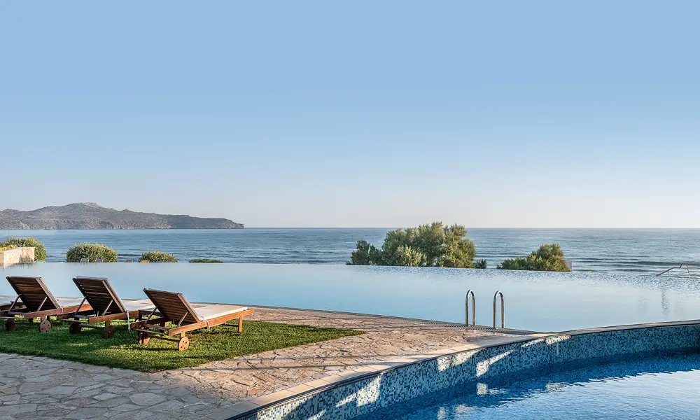 Familjesemester vid Chaniakusten med pooler, havsutsikt och strandliv