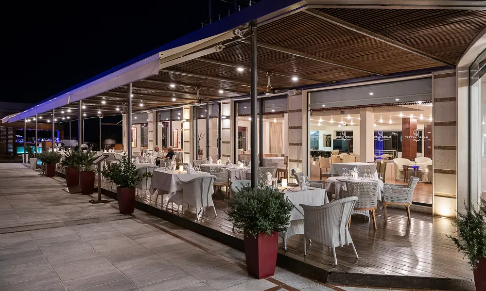 Cretan Dream Resort & Spa erbjuder ett varierat utbud av restauranger och barer som täcker hela dagen. Börja morgonen på Aphrodite Restaurant med en stor internationell frukostbuffé, kryddad med lokala specialiteter. Till lunch och middag serverar Muse À La Carte Restaurant moderna rätter baserade på färska, lokala råvaror.