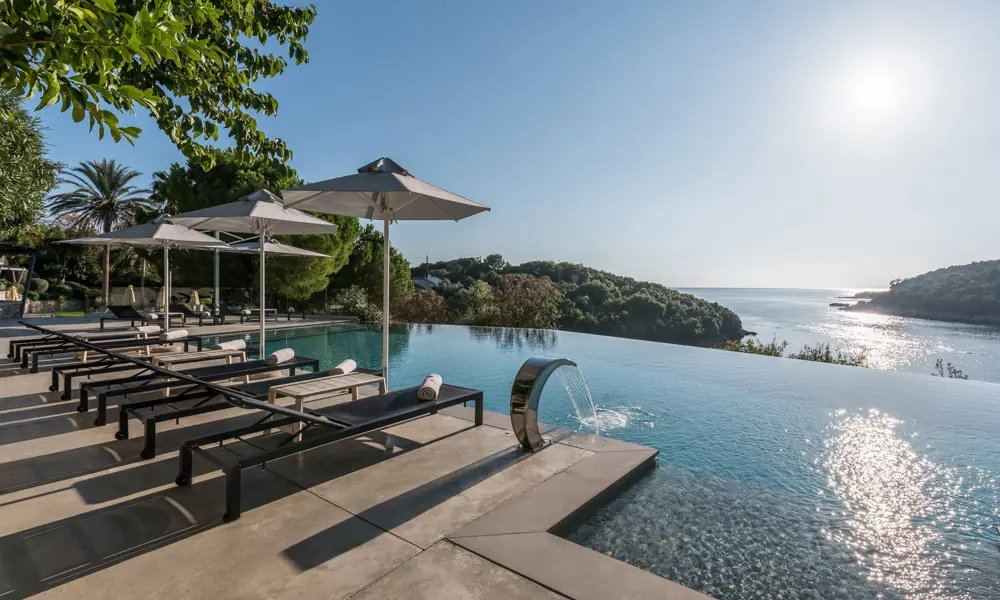 I mitten av hotellet ligger den stora solterrassen med en inbjudande pool med solstolar, parasoller och fantastisk havsutsikt.