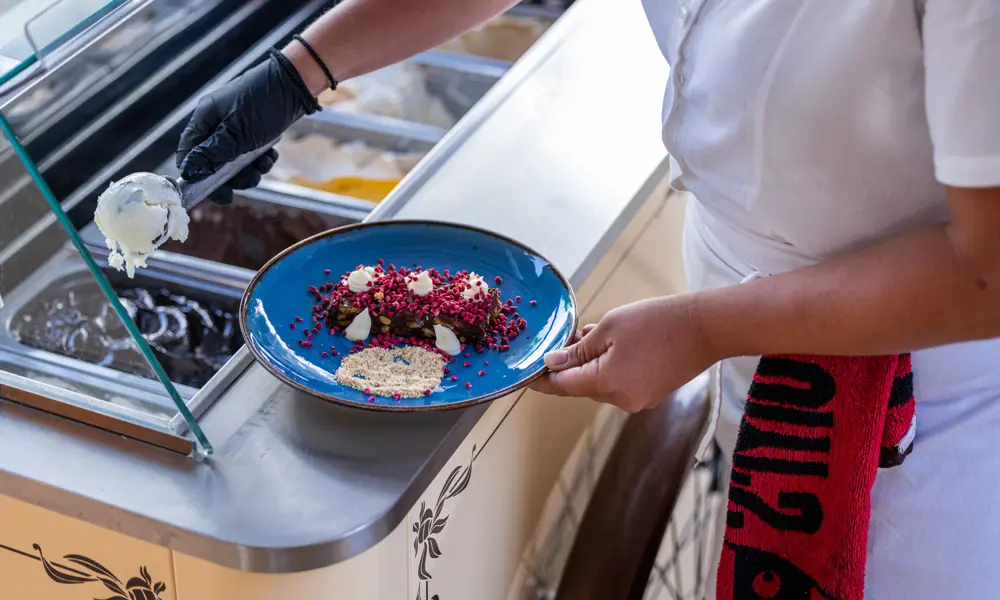 Hotellet har ocksÄ en egen glassbar med upp till 6 smaker, och under hela dagen kan du bestÀlla lÀckra aptitretare i restaurangen.