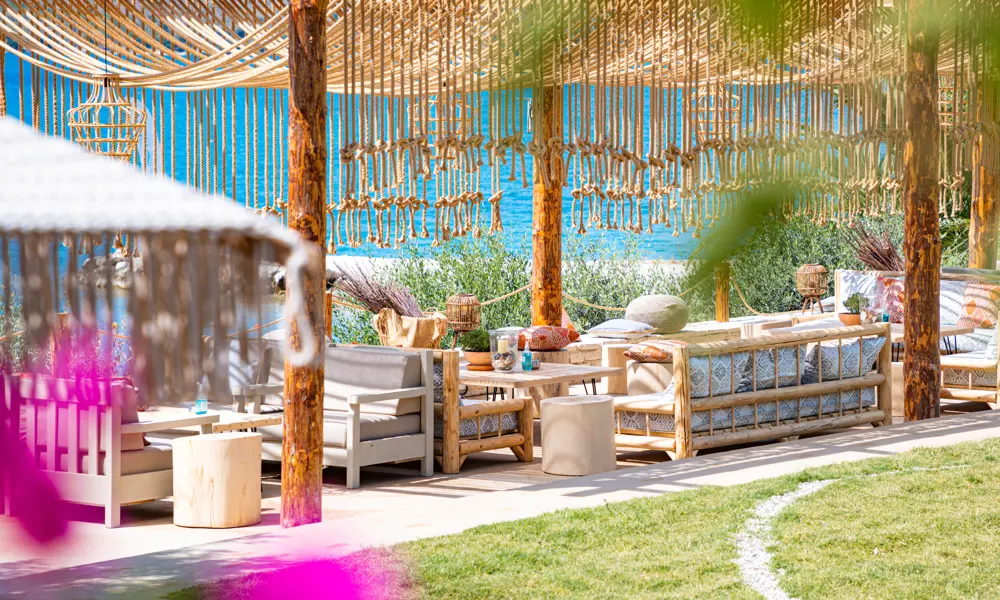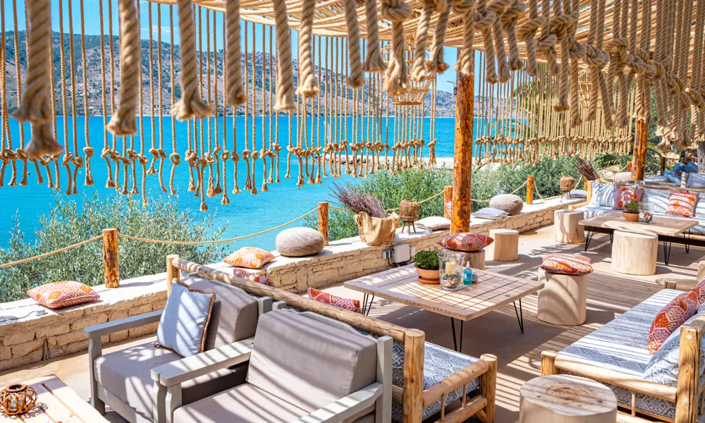 Mysig bar med loungemöbler och havsutsikt