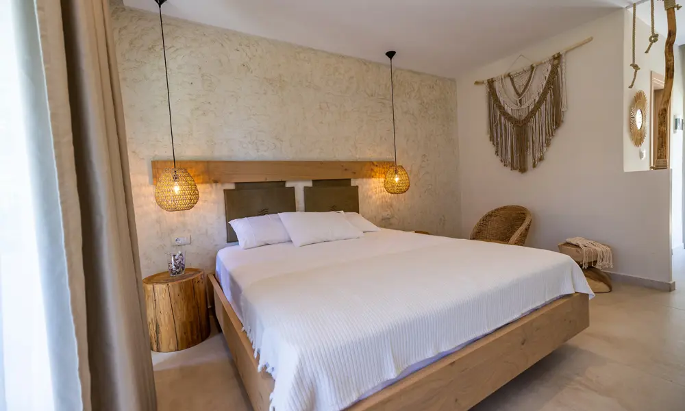 Hotellets 22 rum Àr fördelade pÄ 5 byggnaderoch ligger i 3 rader. Dubbelrummen ligger i andra och tredje raden frÄn det gemensamma omrÄdet med pool, loungeomrÄde, strand etc.