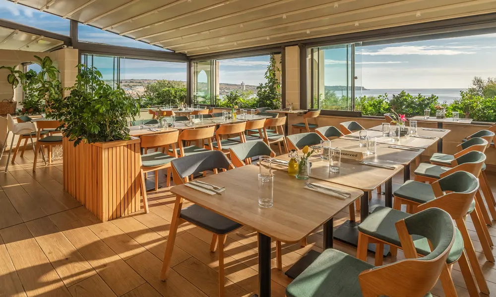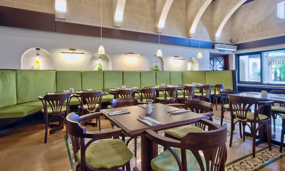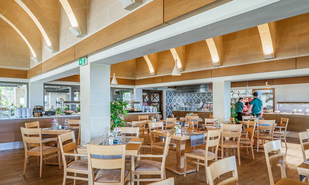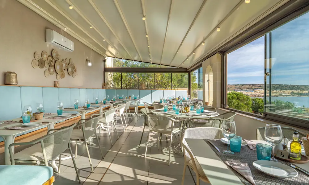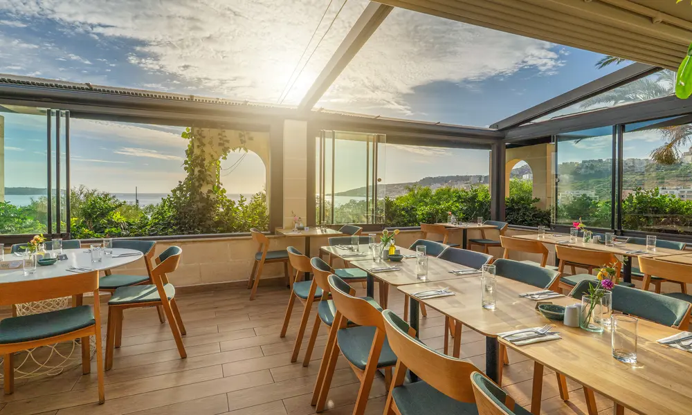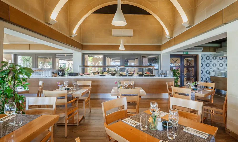 HÀr sitter du i en mysig miljö med gröna soffor och cafébord under runda valv. Ute pÄ den stora terrassen kan du njuta av din mat och utsikten över poolomrÄdet och Mellieha stad vid horisonten. Speciellt pÄ kvÀllen, nÀr bÄde poolen och staden Àr upplysta, Àr synen helt magisk.