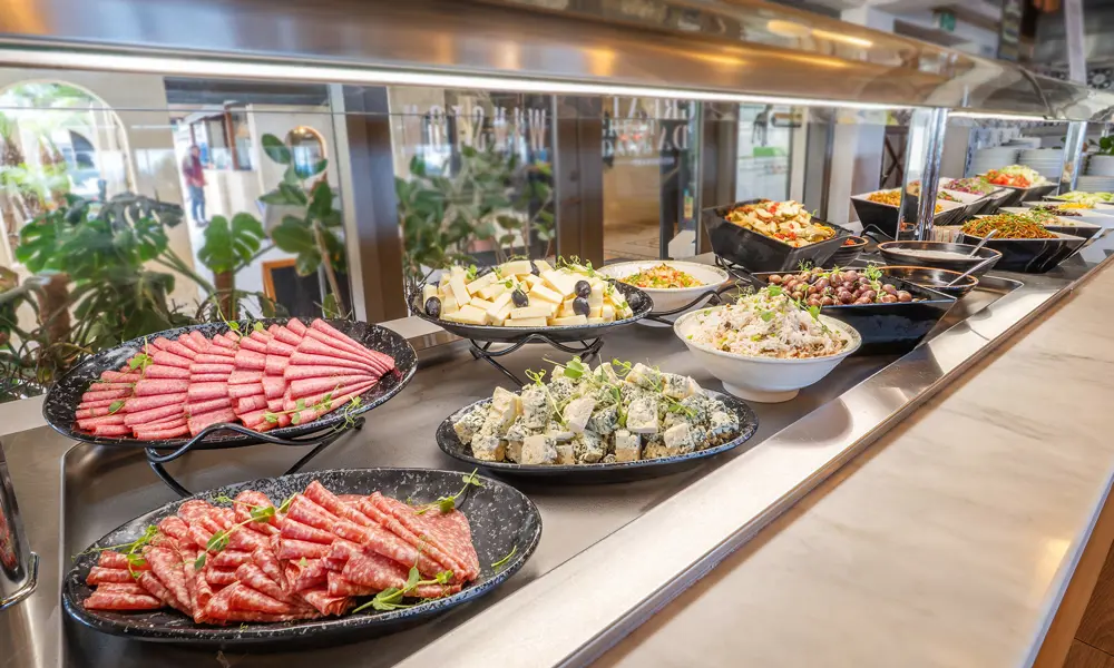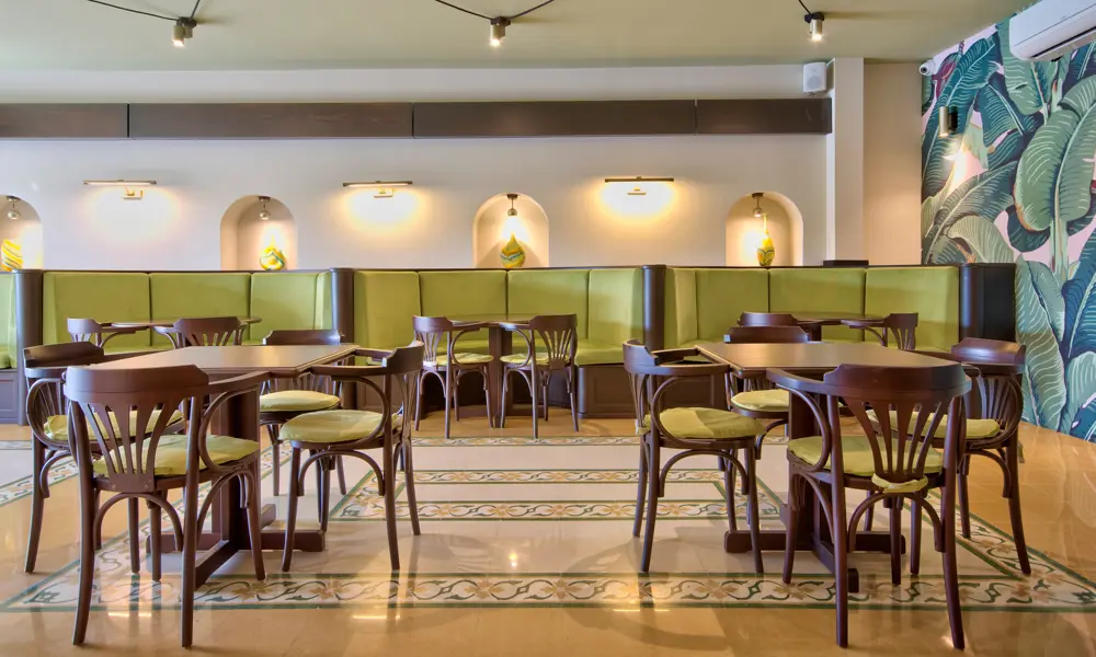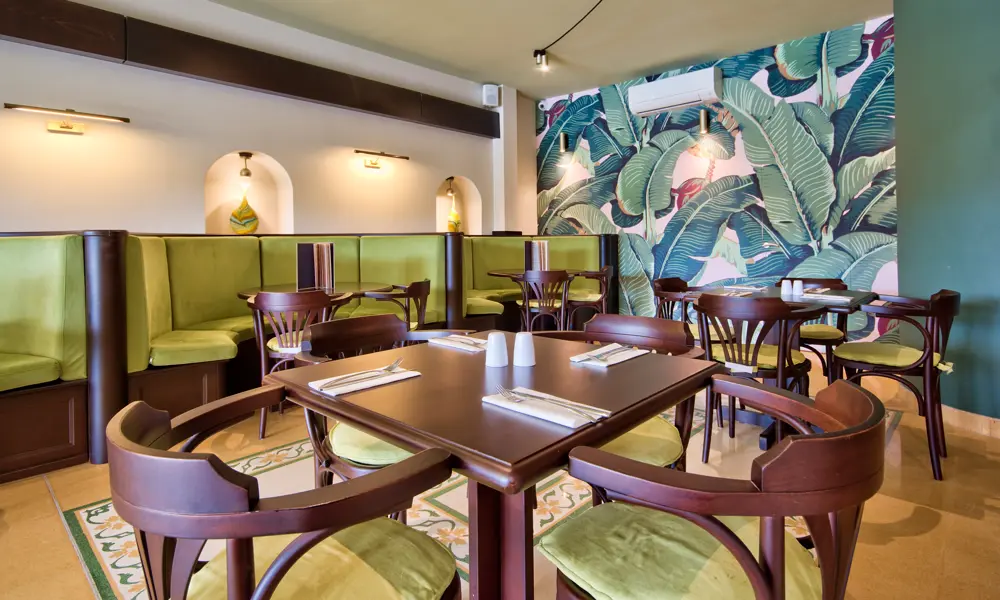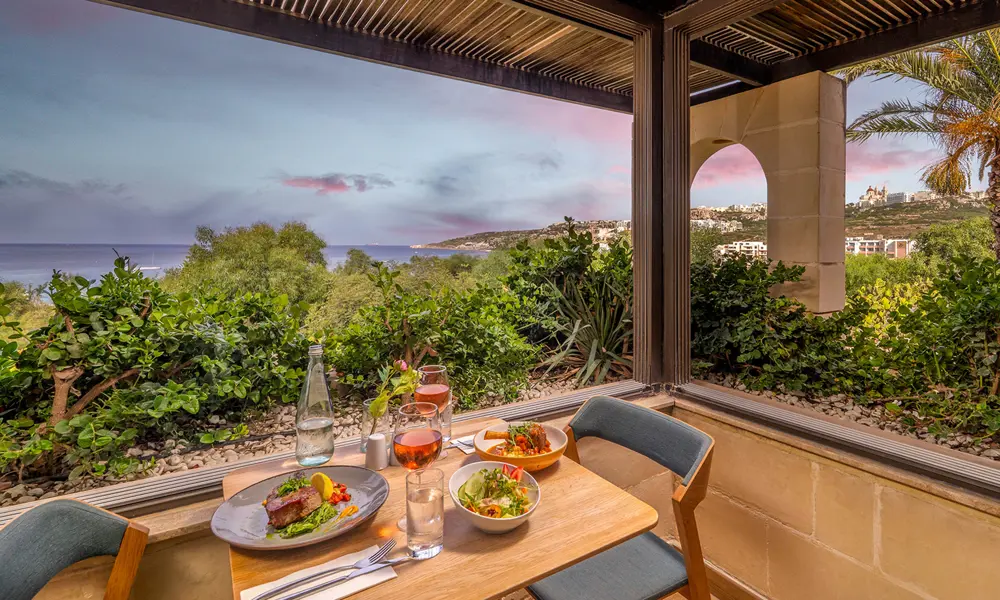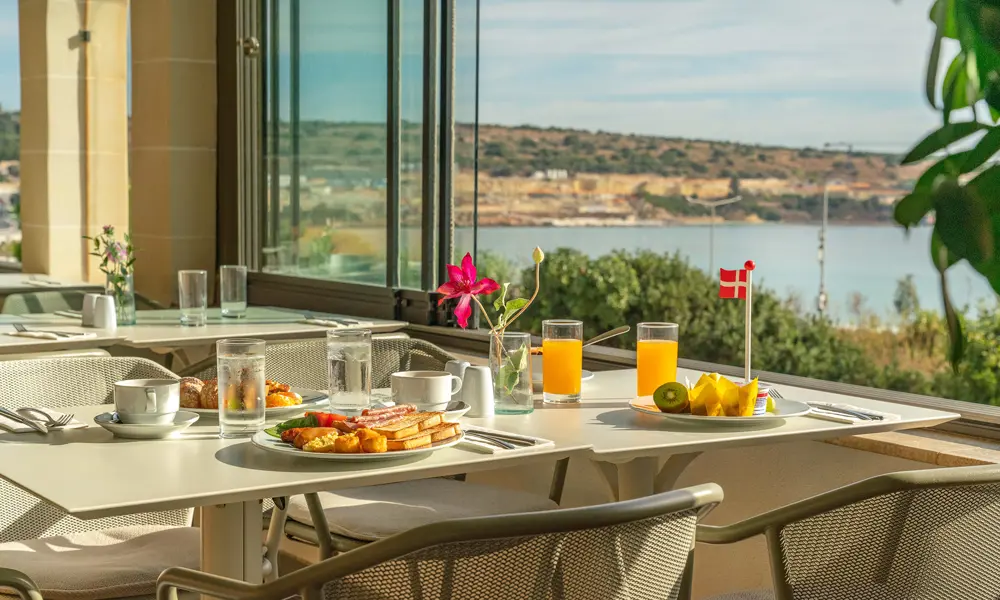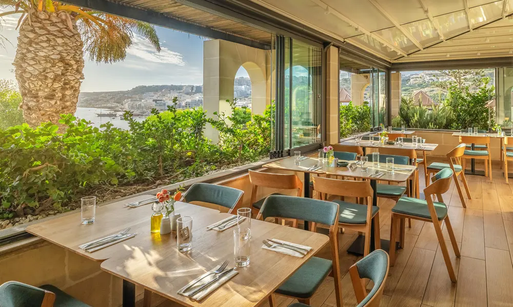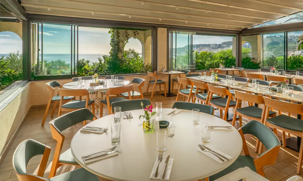 HÀr sitter du i en mysig miljö med gröna soffor och cafébord under runda valv. Ute pÄ den stora terrassen kan du njuta av din mat och utsikten över poolomrÄdet och Mellieha stad vid horisonten. Speciellt pÄ kvÀllen, nÀr bÄde poolen och staden Àr upplysta, Àr synen helt magisk.