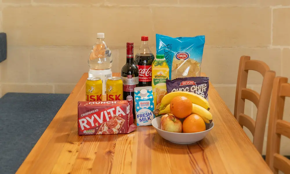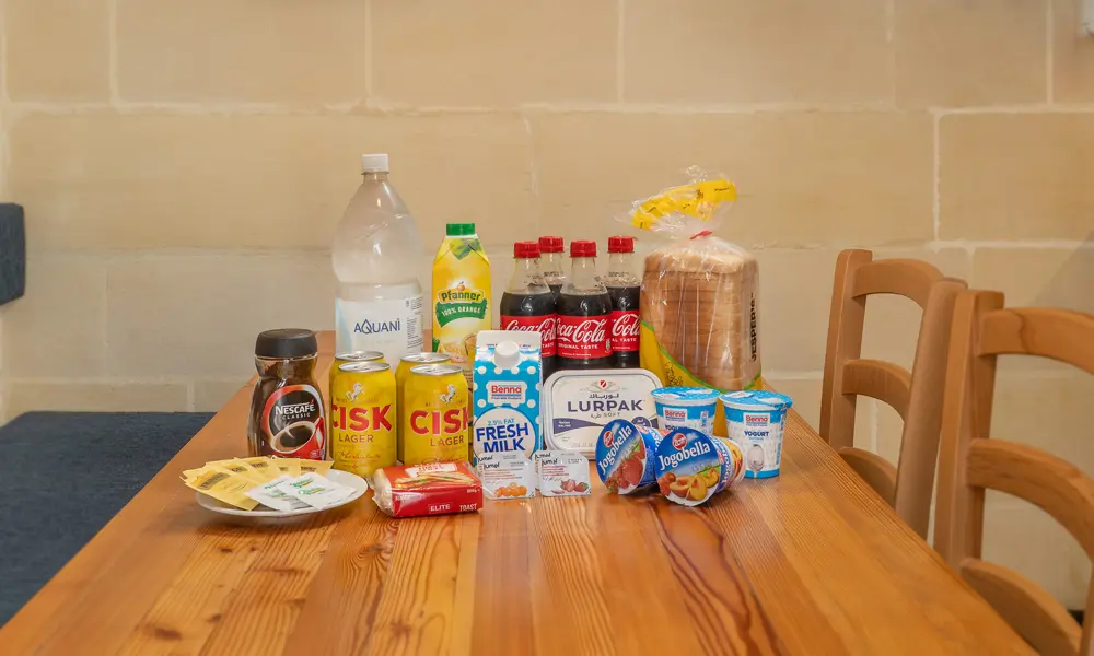 PÄ Mellieha Holiday Centre kan du vÀlja mellan 2 olika vÀlkomstpaket sÄ att du kan "landa" i ditt semesterhus med en full kyl utan att behöva handla först.