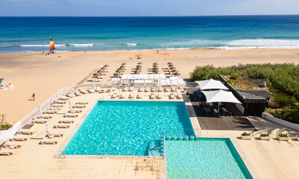 NÄgra meter frÄn havet ligger hotellets stora gemensamma terrass med swimmingpool, barnpool, solstolar, parasoller och en fantastisk utsikt över Atlanten. Vid slutet av poolen vÀntar sandstranden och hotellets strandbar, som Àr öppen under sommarens högsÀsong eller nÀr vÀdret tillÄter. HÀr kan du köpa ett urval av varma och kalla drycker, glass och snacks.